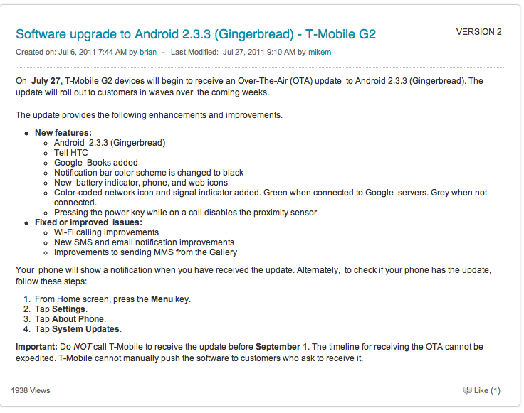 IMPORTANT: DO NOT CALL T-MOBILE TO RECEIVE THE UPDATE BEFORE SEPTEMBER 1. THE TIMELINE FOR RECEIVING THE OTA CANNOT BE EXPEDITED. T-MOBILE CANNOT MANUALLY PUSH THE SOFTWARE TO CUSTOMERS WHO ASK TO RECEIVE IT.